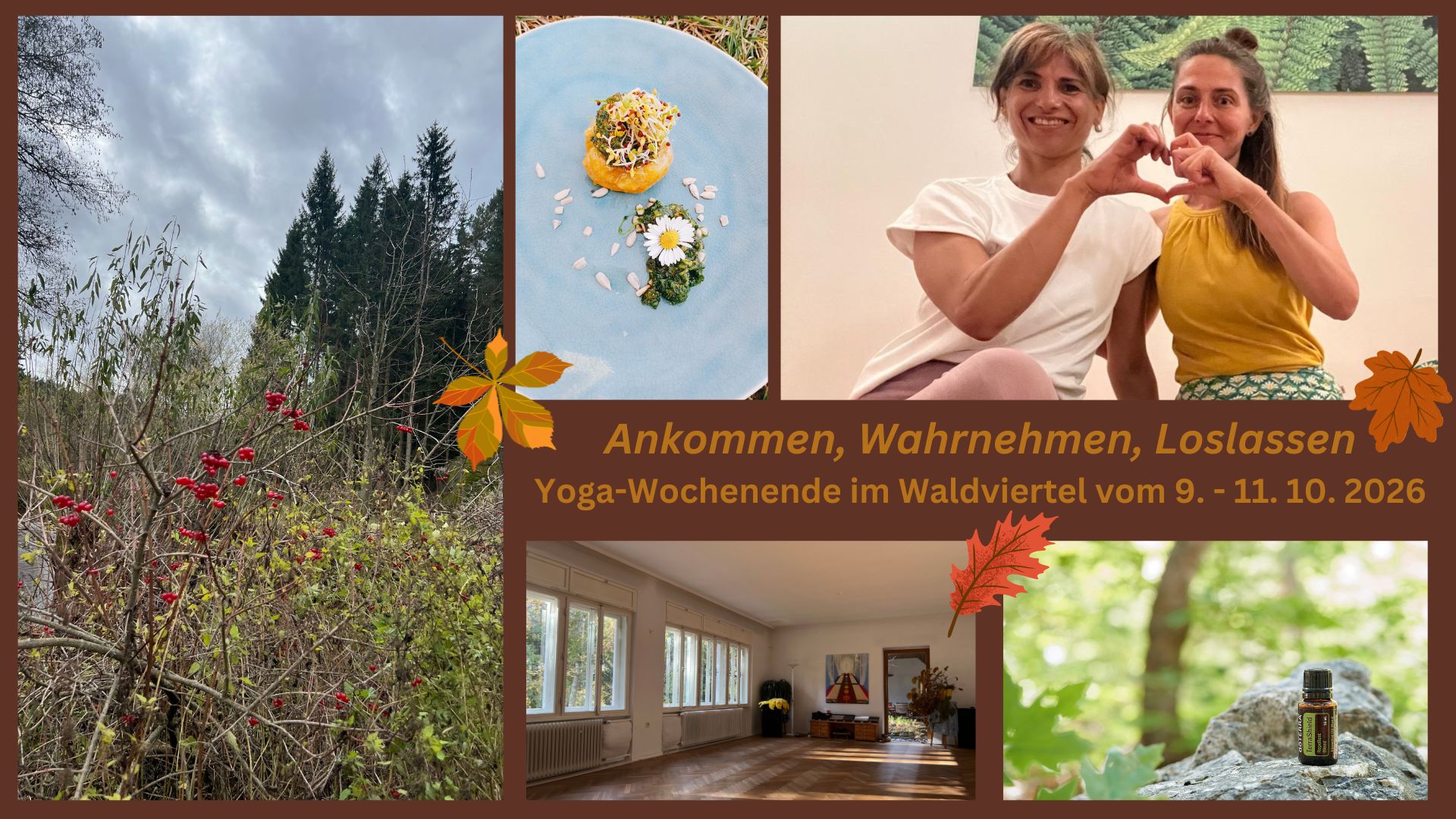 Die Natur webt im Oktober einen farbenprächtigen Landschaftsteppich, und das goldene Herbstlicht scheint auf die bunten Blätter. Im Seminarhaus Sonnenhof in Rapottenstein, umgeben von der wunderschönen Natur des Waldviertels, lässt sich dieses Naturschauspiel mit allen Sinnen genießen. Vom Yogaraum aus blickt man direkt in die Natur.